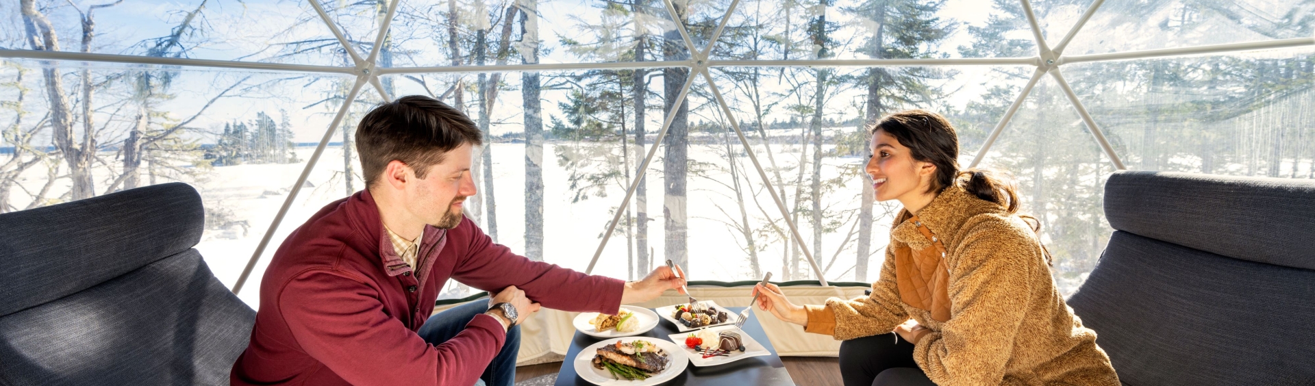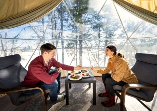 - 2-nights’ accommodation in a Studio Lakeside Glome with a king bed, private deck with hot tub, propane fireplace, 3-piece bathroom (with shower), kitchenette with mini fridge, microwave, convection toaster oven, coffee maker with coffee, dishes, and cutlery, propane BBQ, air conditioning and heat